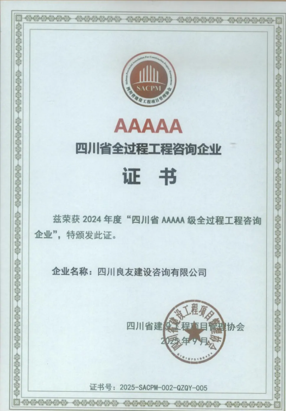 喜報|良友咨詢榮獲2024年度“四川省AAAAA級全過程工程咨詢企業”稱號